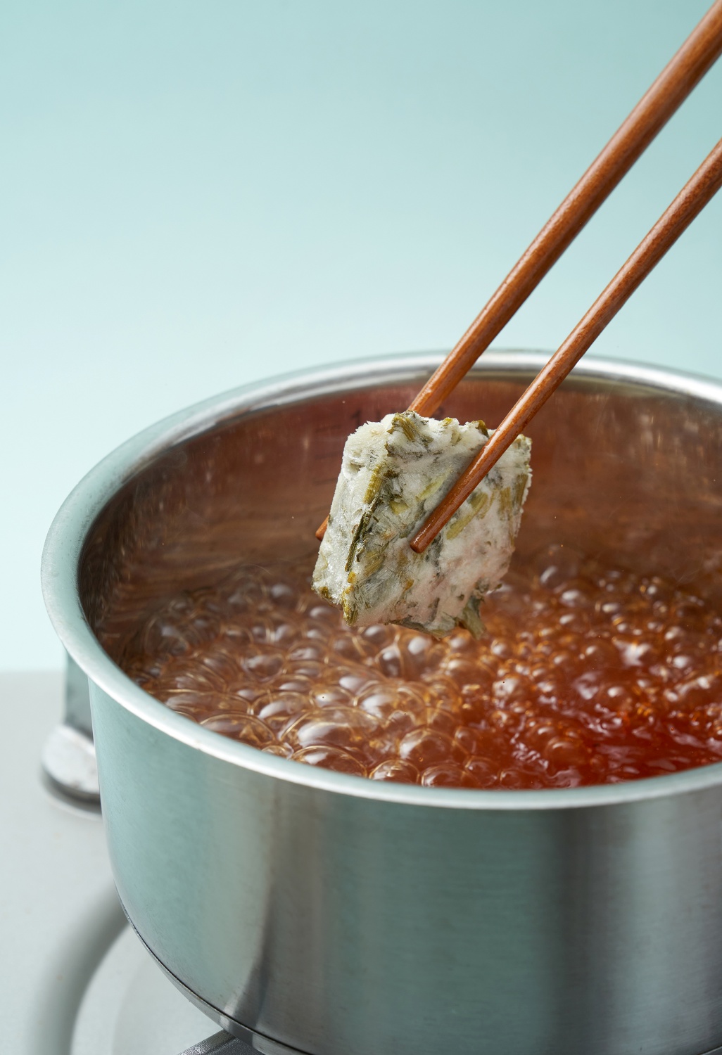 얼큰버섯칼국수에는 디테일이 들어 있다. 우리가 '쫄깃한 맛'이라 인식하는 면의 특징은 '잘 치댈' 때 만들어진다. '잘 치댄다'는 건 밀가루에 물을 더한 뒤 치대는 힘을 많이 가함을 뜻한다. 풀무원은 면을 만들 때 '다가수 진공 숙성 방식'을 썼다. 많이(다) 물을 더해서(가수) 공기 없이(진공) 숙성한다는 뜻이다. 물 함량을 최대한 높여 반죽하고, 진공 상태에서 숙성해 반죽 내 공기층을 없앴다는 의미인데, 이럴 경우 전분 입자에 수분이 잘 배어들어서 잘 익는 면을 만들 수 있다. 거기 더해 숙성으로 글루텐 형성에 도움을 주며, 그 일을 진공 상태에서 하기 때문에 반죽 사이의 공기층이 제거되며 면이 치밀해진다. 그 결과 면이 단단해지며 우리의 입에서 '쫄깃하다'는 느낌이 든다. '쫄깃하다'는 형용사 하나를 위한 기업 단위의 설비와 정성이다.
