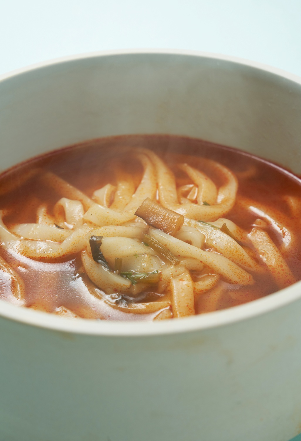 얼큰버섯칼국수는 흥미롭게도 닭칼국수와는 접근법이 다르다. 면은 쫄깃하고 부드럽다. 육수는 적당히 진하고 적절히 얼큰한 소고기 베이스. 시중의 '샤브 칼국수'가 떠오르는 그 맛이다. 거기 더해 얼큰버섯칼국수는 조리가 더 쉽다. 일선 우동에서 쓰는 기술인, 한 번 삶아서 포장한 면을 써서다. 그 덕에 닭칼국수의 조리 시간이 5분인 반면 얼큰버섯칼국수의 조리 시간은 1분 30초다. 한번 삶은 면이므로 국물 역시 상대적으로 더 깔끔하다.