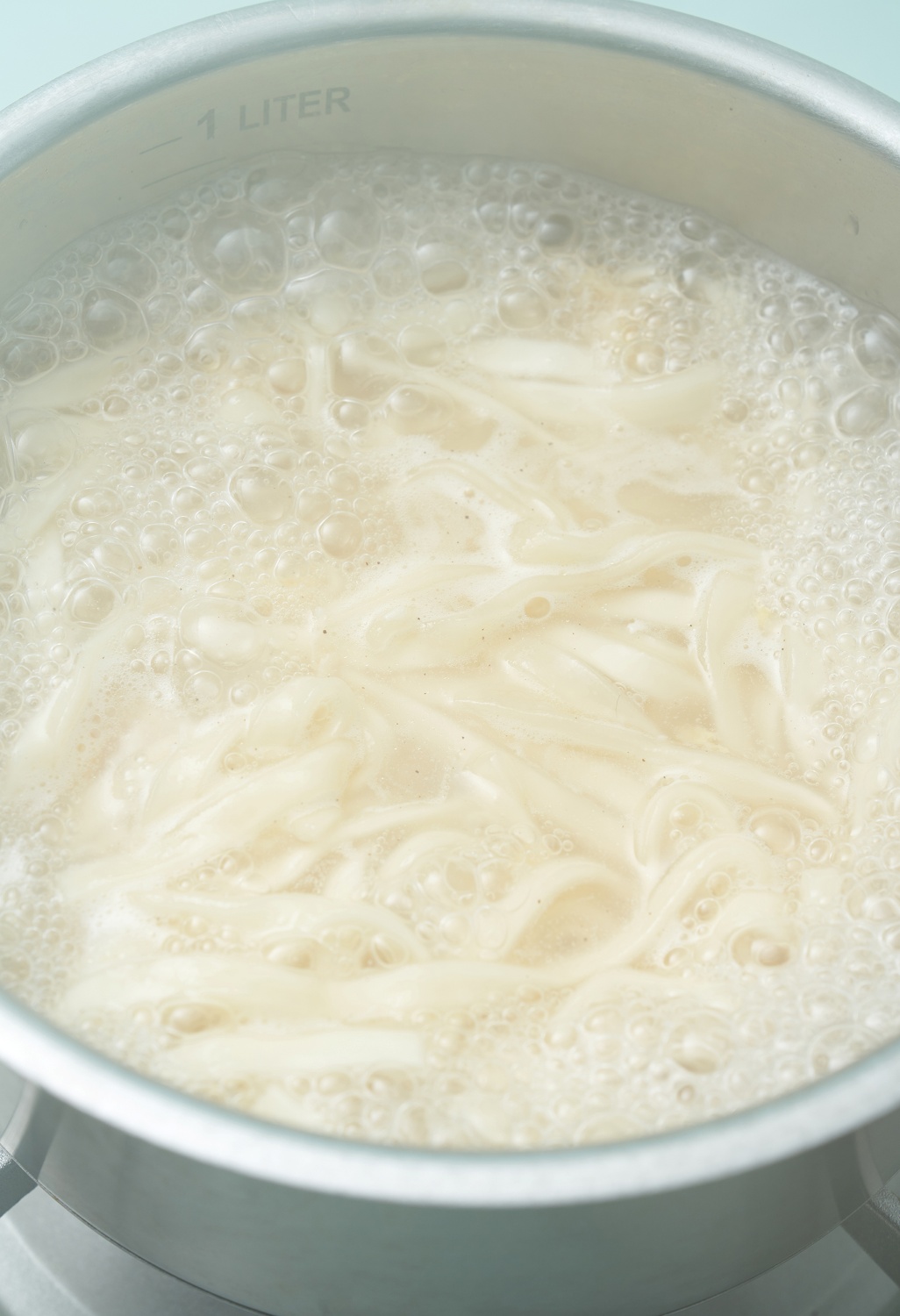 얼큰버섯칼국수에는 디테일이 들어 있다. 우리가 '쫄깃한 맛'이라 인식하는 면의 특징은 '잘 치댈' 때 만들어진다. '잘 치댄다'는 건 밀가루에 물을 더한 뒤 치대는 힘을 많이 가함을 뜻한다. 풀무원은 면을 만들 때 '다가수 진공 숙성 방식'을 썼다. 많이(다) 물을 더해서(가수) 공기 없이(진공) 숙성한다는 뜻이다. 물 함량을 최대한 높여 반죽하고, 진공 상태에서 숙성해 반죽 내 공기층을 없앴다는 의미인데, 이럴 경우 전분 입자에 수분이 잘 배어들어서 잘 익는 면을 만들 수 있다. 거기 더해 숙성으로 글루텐 형성에 도움을 주며, 그 일을 진공 상태에서 하기 때문에 반죽 사이의 공기층이 제거되며 면이 치밀해진다. 그 결과 면이 단단해지며 우리의 입에서 '쫄깃하다'는 느낌이 든다. '쫄깃하다'는 형용사 하나를 위한 기업 단위의 설비와 정성이다.