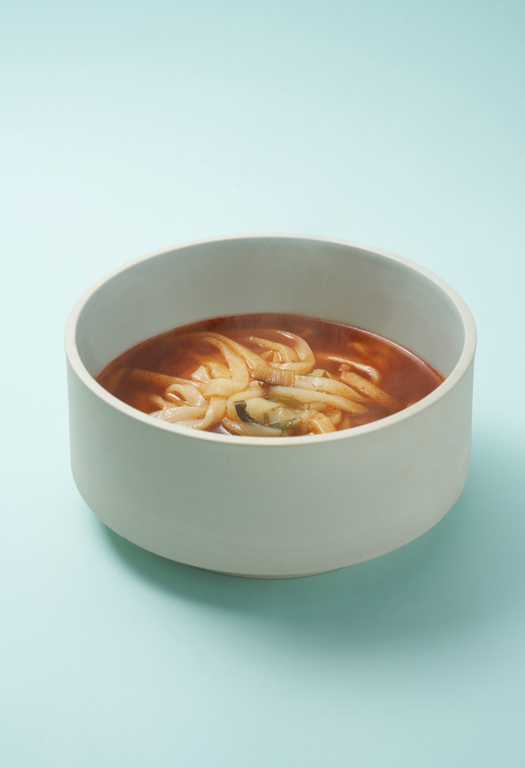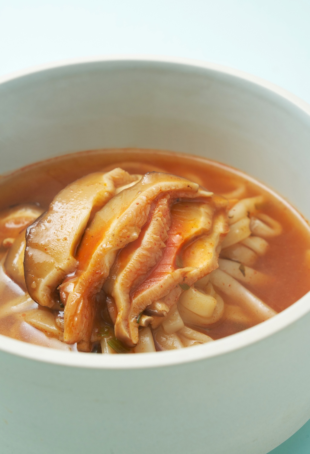 얼큰버섯칼국수는 흥미롭게도 닭칼국수와는 접근법이 다르다. 면은 쫄깃하고 부드럽다. 육수는 적당히 진하고 적절히 얼큰한 소고기 베이스. 시중의 '샤브 칼국수'가 떠오르는 그 맛이다. 거기 더해 얼큰버섯칼국수는 조리가 더 쉽다. 일선 우동에서 쓰는 기술인, 한 번 삶아서 포장한 면을 써서다. 그 덕에 닭칼국수의 조리 시간이 5분인 반면 얼큰버섯칼국수의 조리 시간은 1분 30초다. 한번 삶은 면이므로 국물 역시 상대적으로 더 깔끔하다.